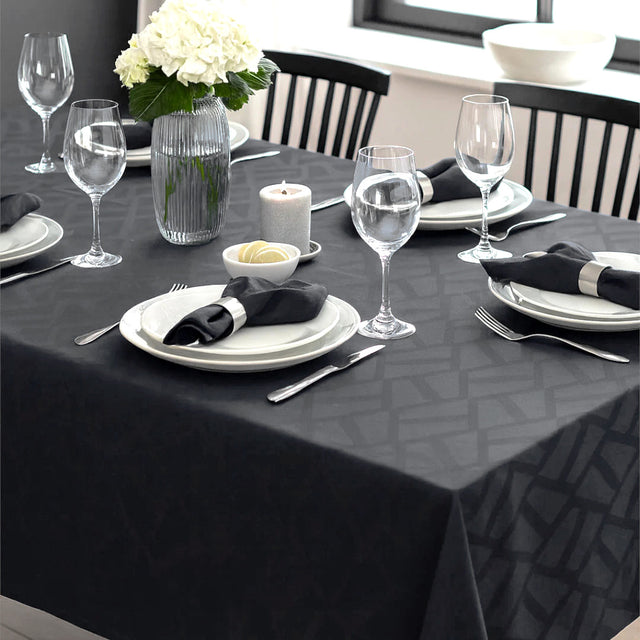 Compliments Ice Damastduk i grå/antracit kombinerar klassisk damastväv med ett modernt, grafiskt mönster. Den dämpade designen ger en harmonisk och lugn yta på bordet.