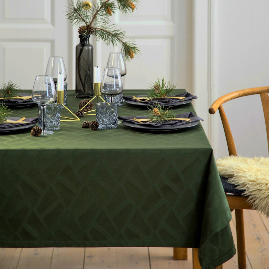 Compliments Ice Damastduk i grön liknar den klassiska ”Old English Racing Green”. Den djupa, mättade färgen ger ett lugnt och tidlöst uttryck som smälter in i modern nordisk inredning.