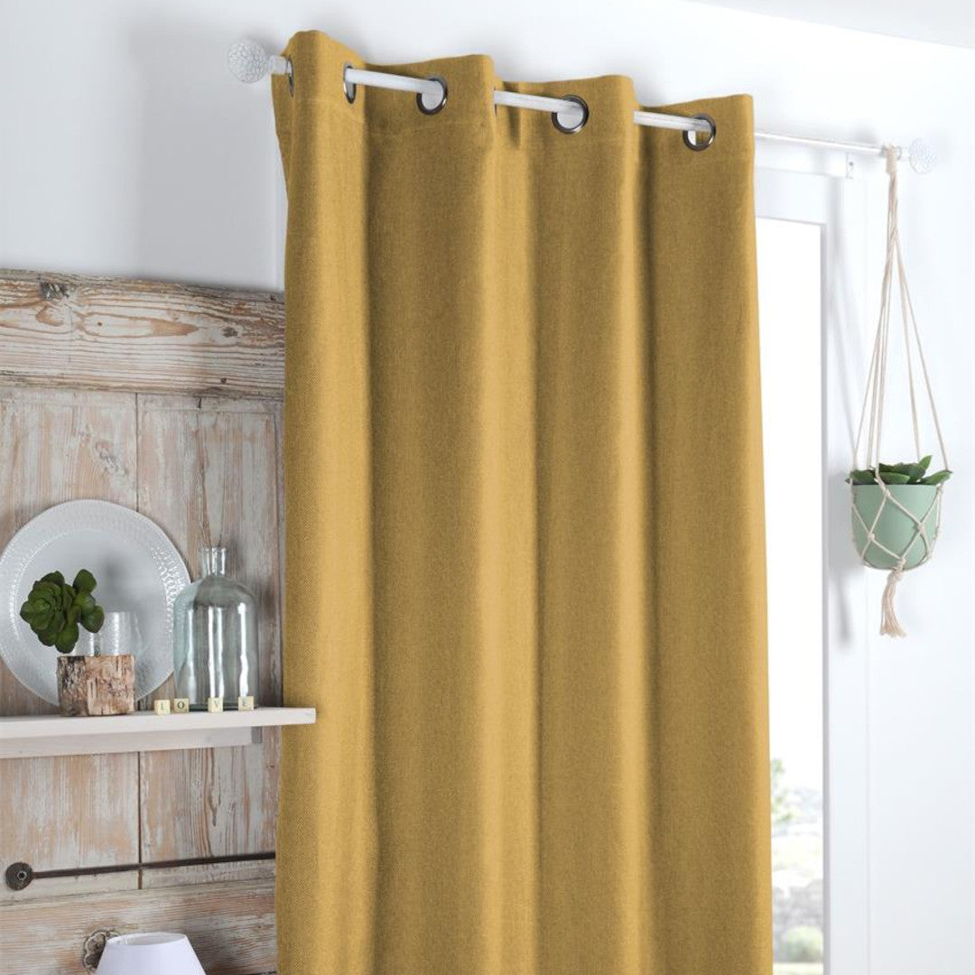 Den senapsgula färgen ger en modern och energisk kontrast till inredningen, medan den strukturerade väven säkerställer en elegant och stilfull look. Gardinen fungerar även som en effektiv mörkläggningsgardin som skyddar mot ljus och säkerställer privatliv.