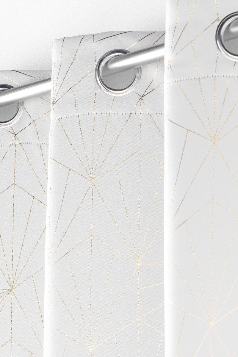 Eclat Vit är en elegant mörkläggningsgardin med ett modernt geometriskt mönster i gyllene metalliska linjer som ger ett exklusivt och sofistikerat uttryck. Den vita basfärgen reflekterar ljuset vackert och framhäver den fina designen, perfekt för både vardagsrum och sovrum.