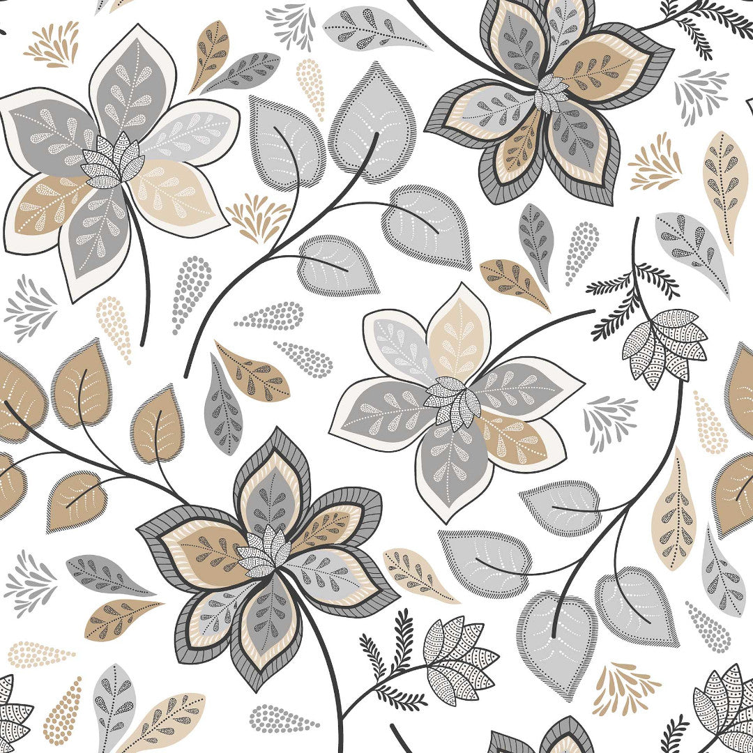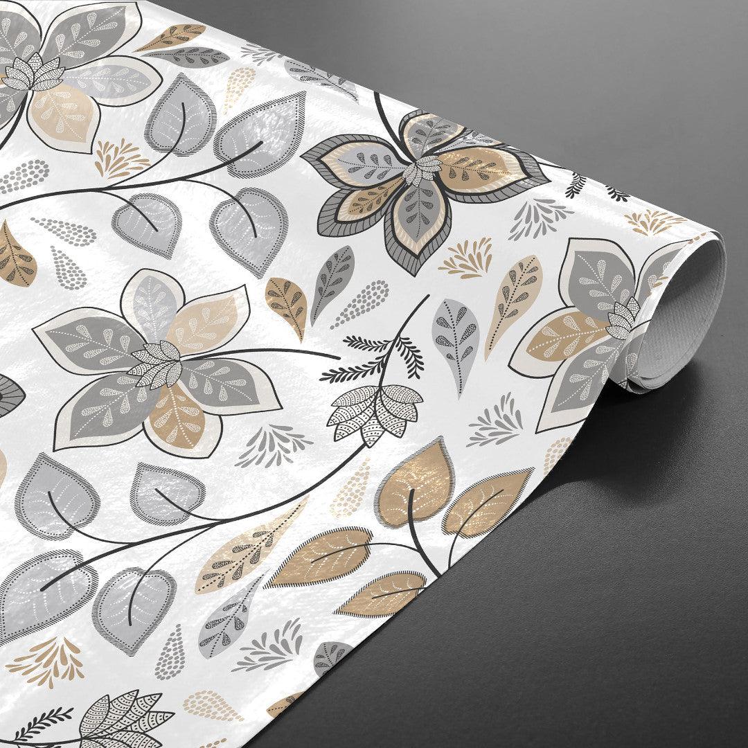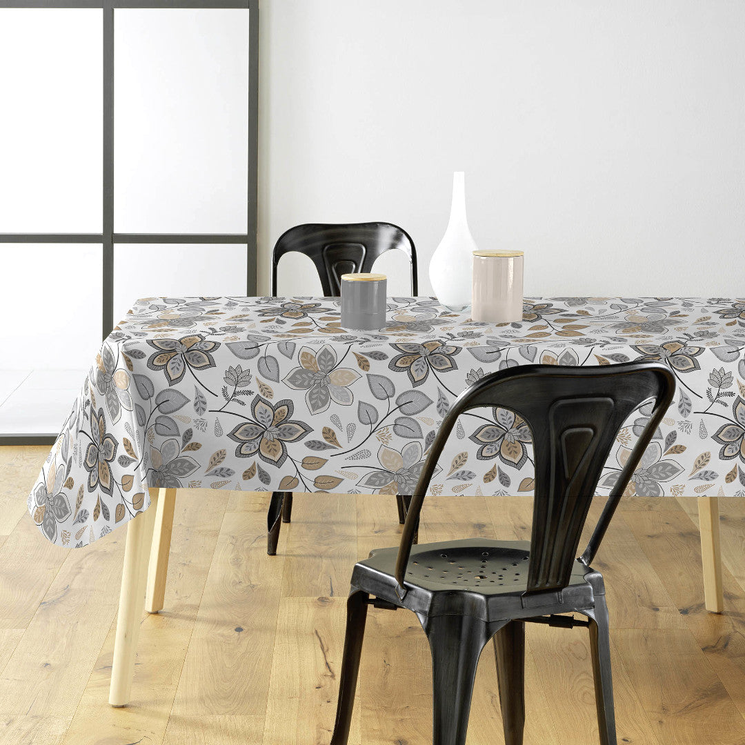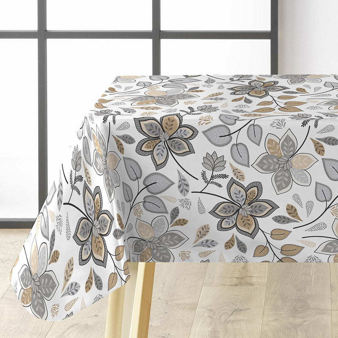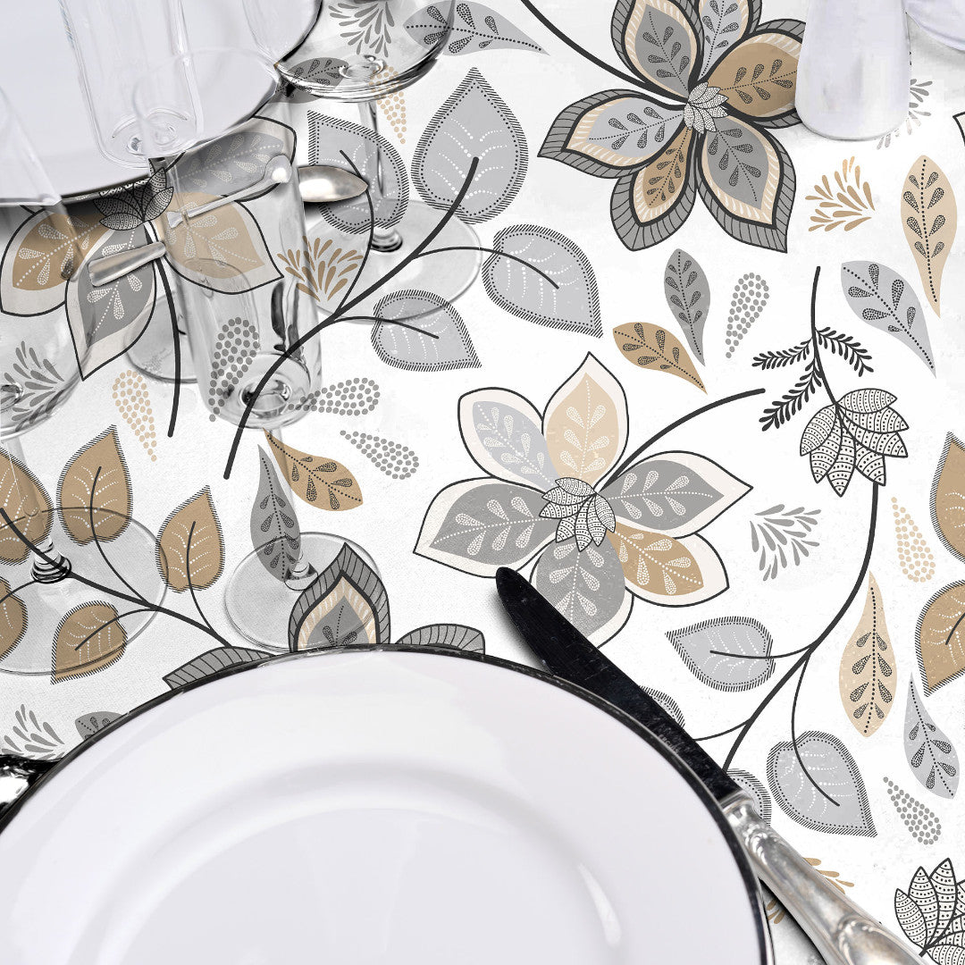 Gloriette är en vacker vaxduk med dekorativa blommor och blad i dämpade nyanser av grått och sand. Mönstret har en handritad känsla som ger ett naturligt och harmoniskt uttryck.