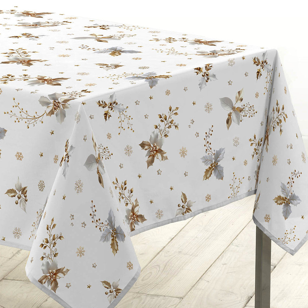 Guido Blanc i storlek 150 x 300 cm är en ljus och klassisk julduk med ett dämpat mönster i gyllene och silvergrå nyanser. De fina motiven av järnek, blad och bär ger duken ett lugnt och traditionellt uttryck som passar perfekt för julens långa matbord.