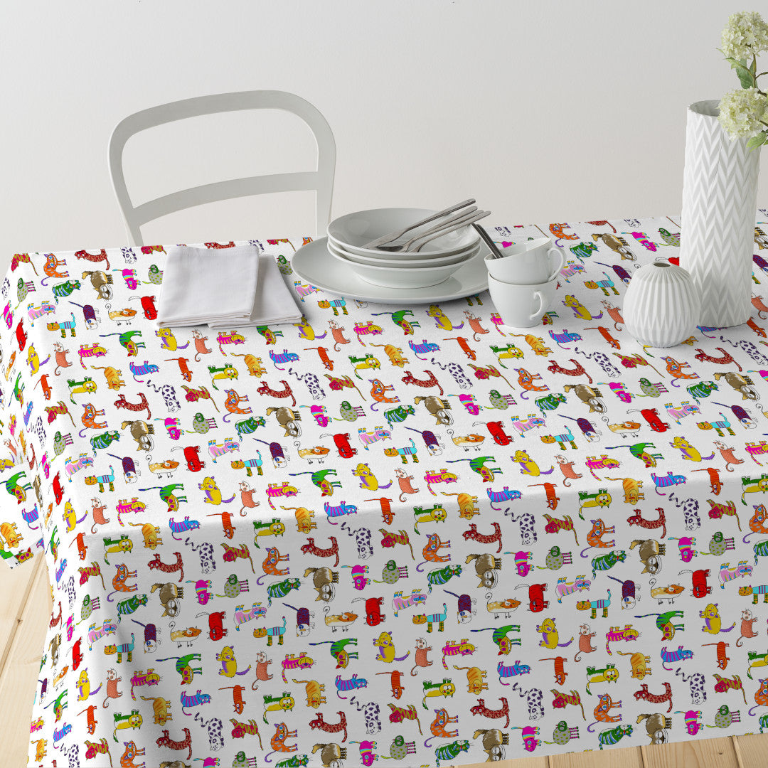 En livfull och glad duk fylld med tokiga, färgglada katter som får både barn och vuxna att le. Mönstret är handritat och tryckt på en lätt offwhite bakgrund, vilket gör att färgerna framträder tydligt utan att bli för starka.