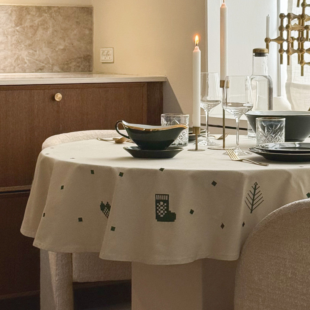 Julia Grön är en rund julgransmatta som även passar som julduk. Den ljusa bomullsbasen är broderad med små gröna motiv – julgranar, paket och strumpor – som bildar ett enkelt mönster runt hela kanten. Färgkombinationen ger ett lugnt och naturligt uttryck som passar perfekt under julhelgen.