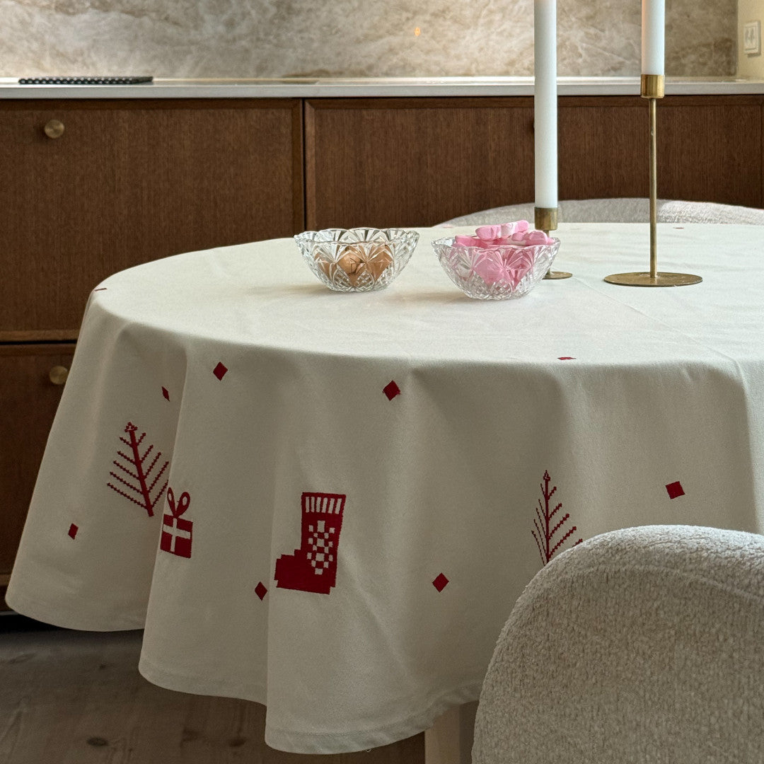 Julia Röd är en rund julduk som också kan användas som julgransmatta. Den ljusa basen är dekorerad med små röda broderier av julgranar, paket och strumpor, vilket skapar ett lugnt och igenkännbart motiv. Mönstret löper längs kanten och ramar in bordet på ett vackert sätt.