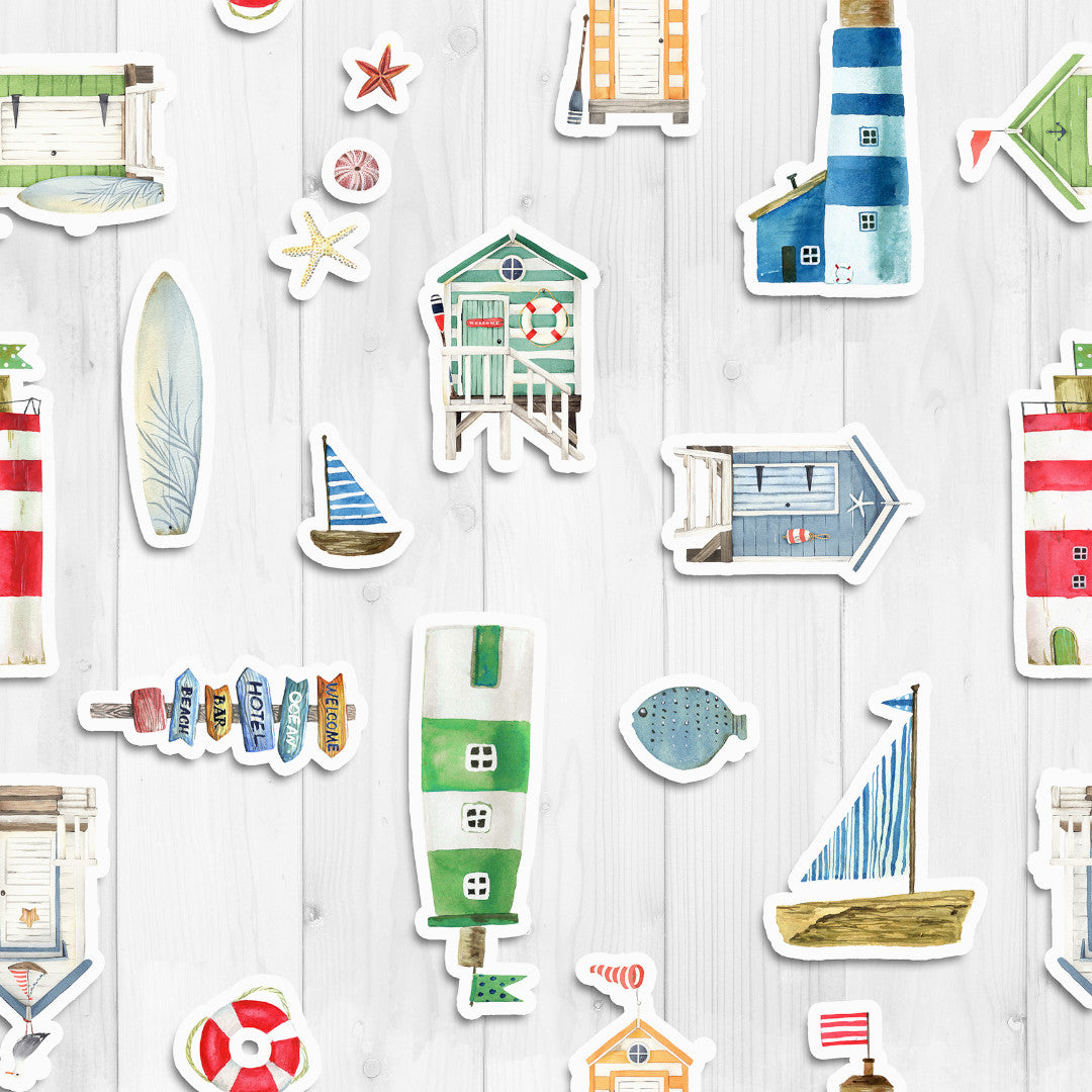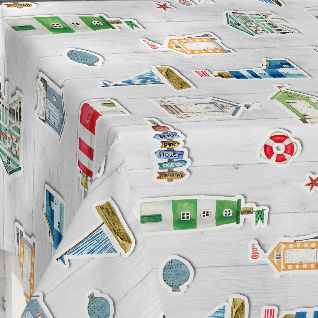 En livfull och färgglad duk som väcker minnen av strandliv och sommardagar vid havet. Mönstret består av små, handmålade illustrationer av fyrar, badhytter, segelbåtar, surfbrädor och strandskyltar – allt i mjuka akvarellfärger som ligger på en bakgrund av ljus grå trästruktur.