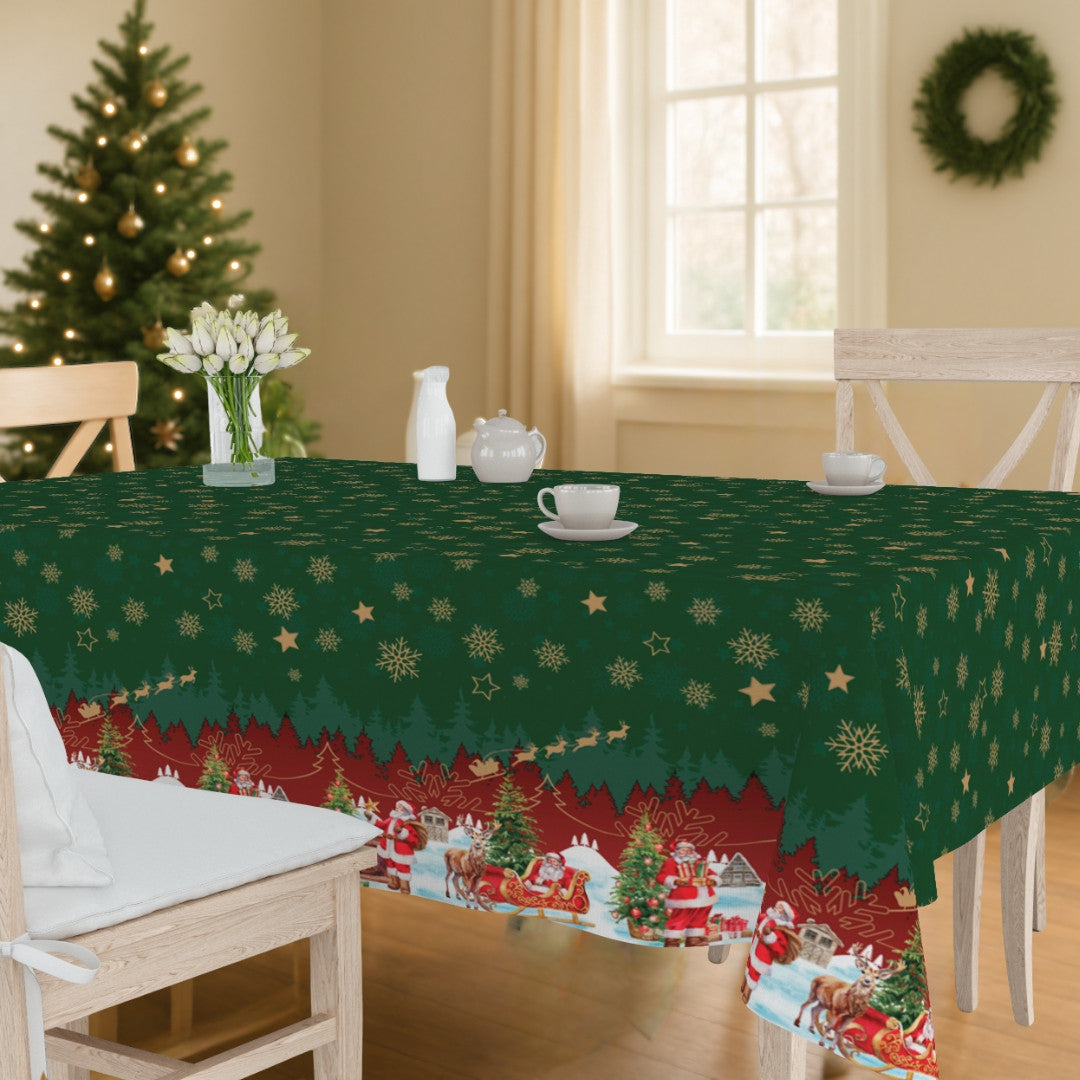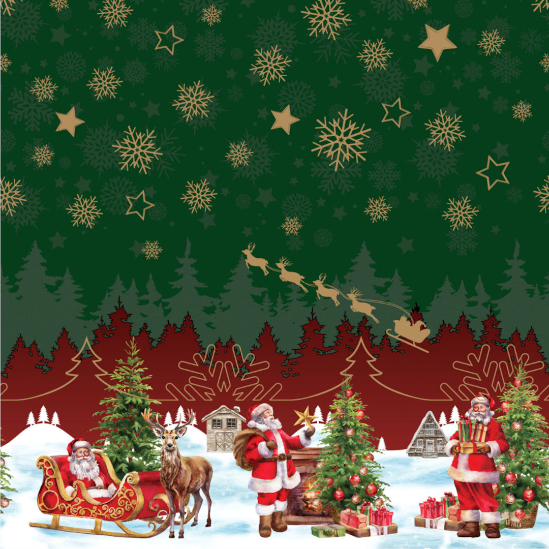 Nisseby grön julvaxduk är full av julstämning och tradition. Den djupt gröna himlen skapar en vacker kontrast till det snötäckta landskapet med tomten, renar och dekorerade granar. Gyllene snöflingor och stjärnor pryder mitten av duken och ger en varm, klassisk look.