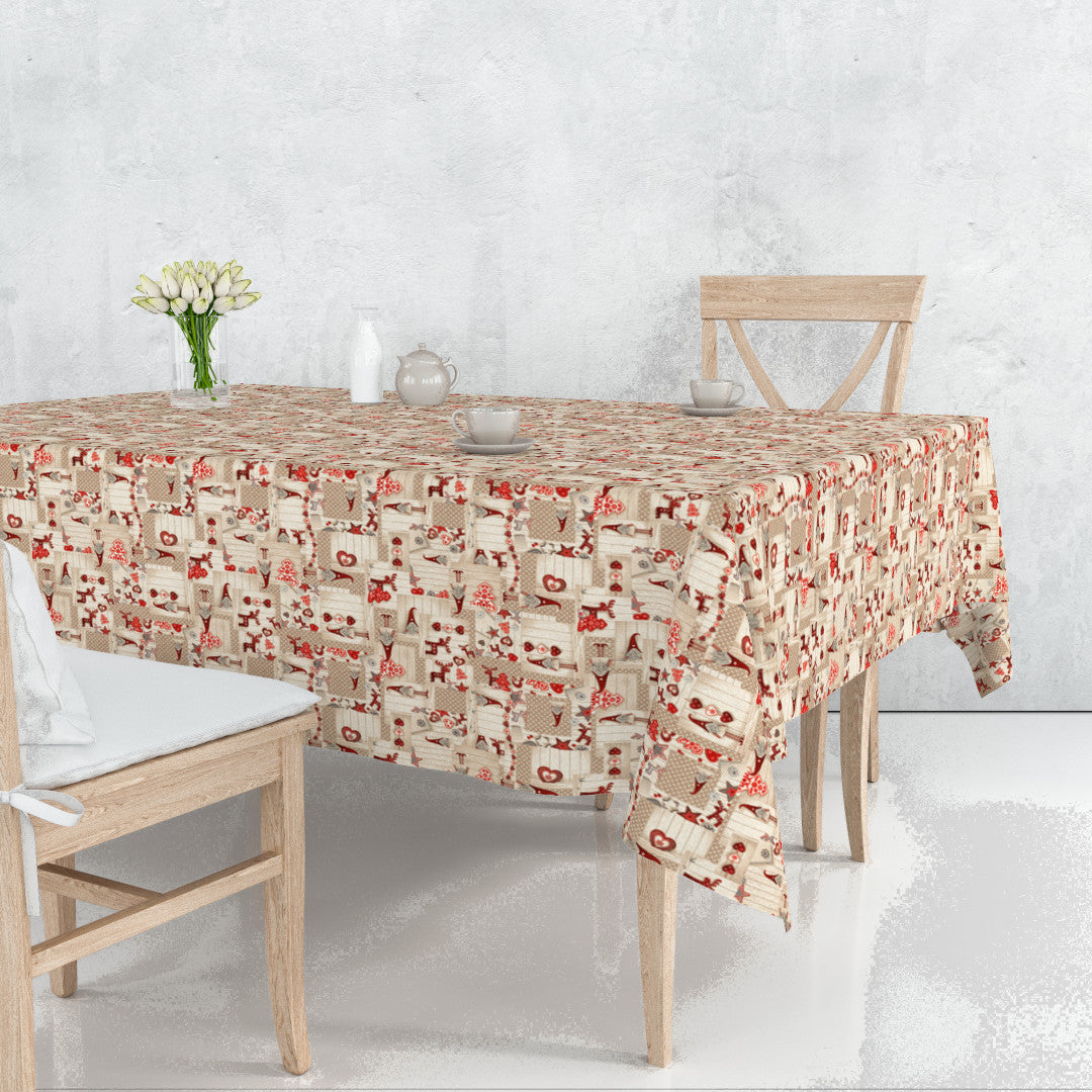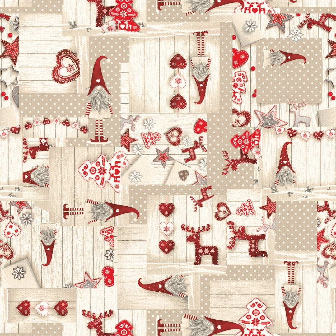 Nissehjerte förenar det bästa av den nordiska julen – mysiga tomtar, fina hjärtan, stjärnor och små renar i ett varmt patchworkmönster. Färgerna i rött, vitt och beige ger duken ett lugnt och rustikt uttryck som passar perfekt i både lantlig och modern miljö.
