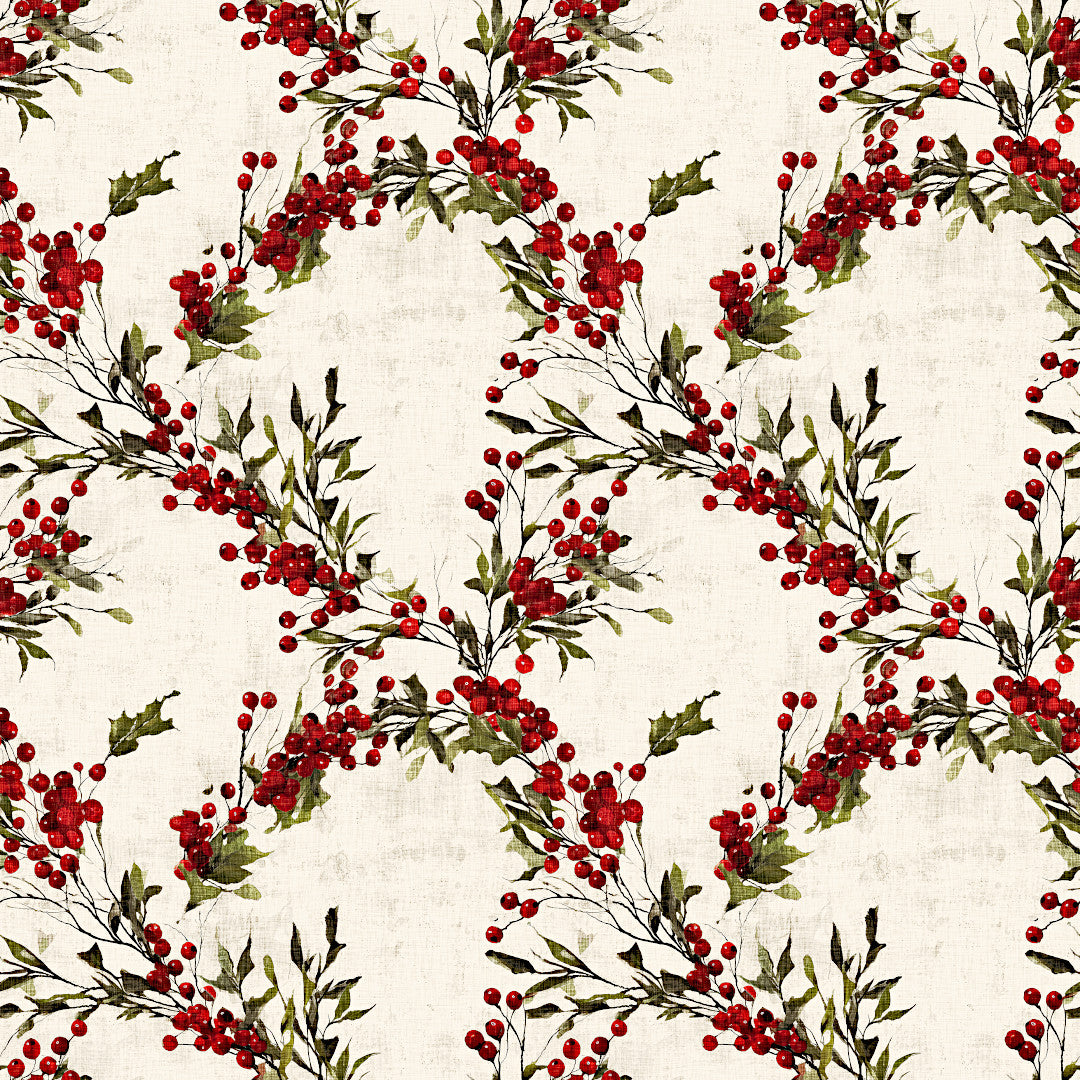 Nordfavn Bessie är en elegant jultextilduk med ett klassiskt mönster av röda bär och gröna grenar på en ljus, lätt melerad naturlig bakgrund. Mönstret har en handmålad känsla som ger duken en varm och livfull karaktär utan att kännas tung. Den utstrålar nordisk jul – enkel, traditionell och vacker.