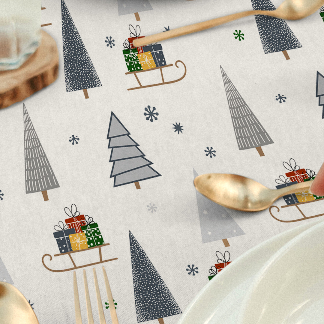 Nordfavn Pine är en lätt och modern jultextilduk med ett stilrent motiv av julgranar och små slädar lastade med klappar. De dämpade grå och blå nyanserna ger ett lugnt helhetsintryck, medan detaljer i grönt och gyllene tillför värme och julstämning på ett subtilt sätt.