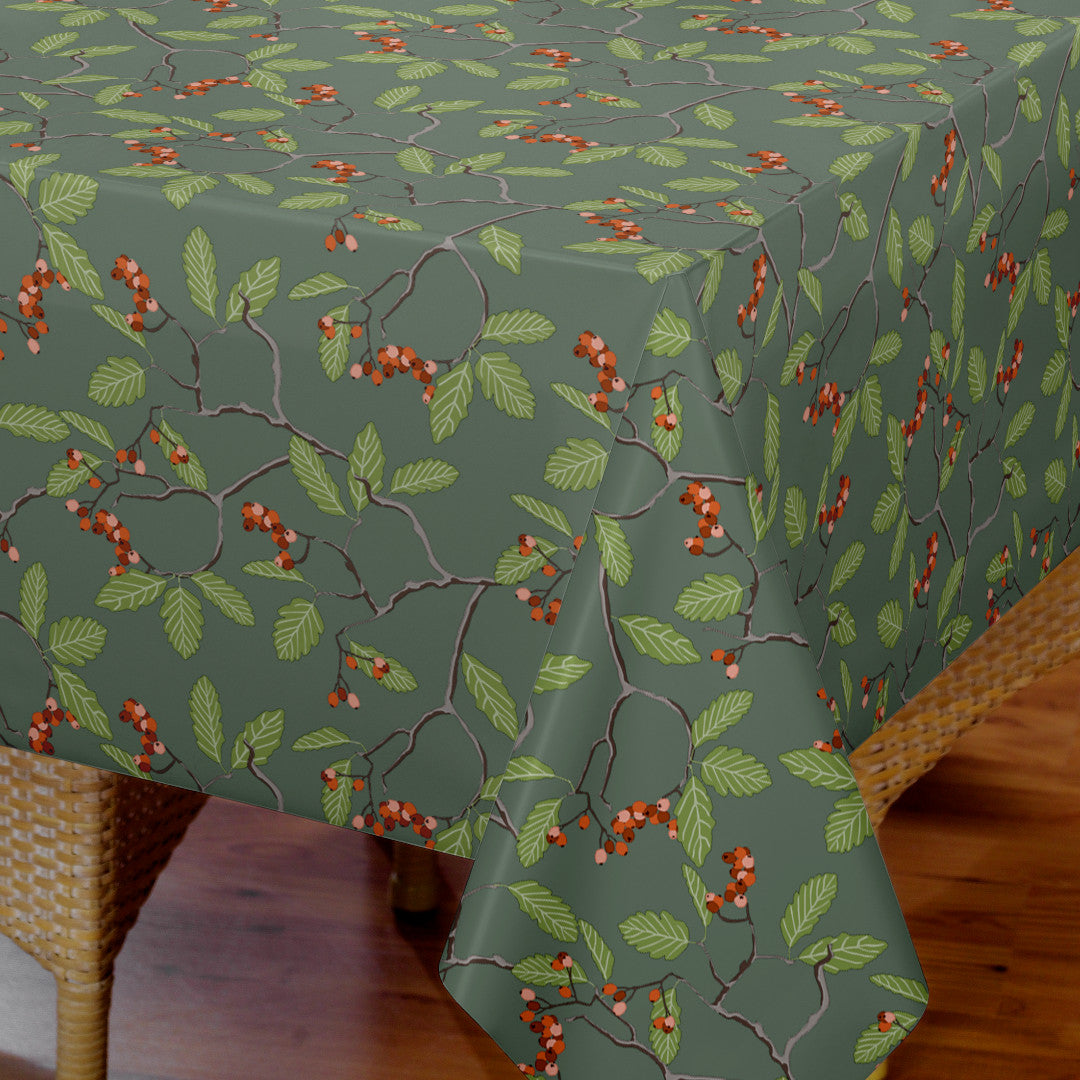 Nordfavn Winter Berry är en vaxduk inspirerad av nordiska vinterlandskap. De fina grenarna slingrar sig över en mörkgrön bakgrund, dekorerade med röda bär och friskt gröna blad. Färgerna ger ett naturligt och livfullt uttryck, medan mönstret behåller en lugn balans – perfekt för årstiden när naturen drar sig tillbaka och vi samlas runt bordet.