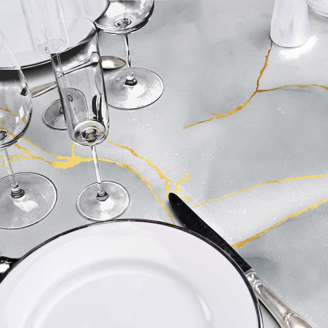 Letar du efter en elegant rund vaxduk med ett exklusivt utseende? Glitter Marbrella är en vacker rund vaxduk med marmormönster, fina gyllene ådror och en diskret glittereffekt som fångar ljuset på ett fantastiskt sätt.