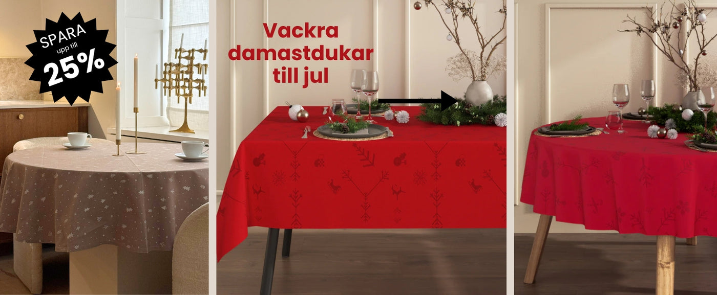 Nästan alla våra dukar kan beställas som runda, ovala eller med resår. Gå in på den önskade duken för att se om dessa alternativ är tillgängliga.